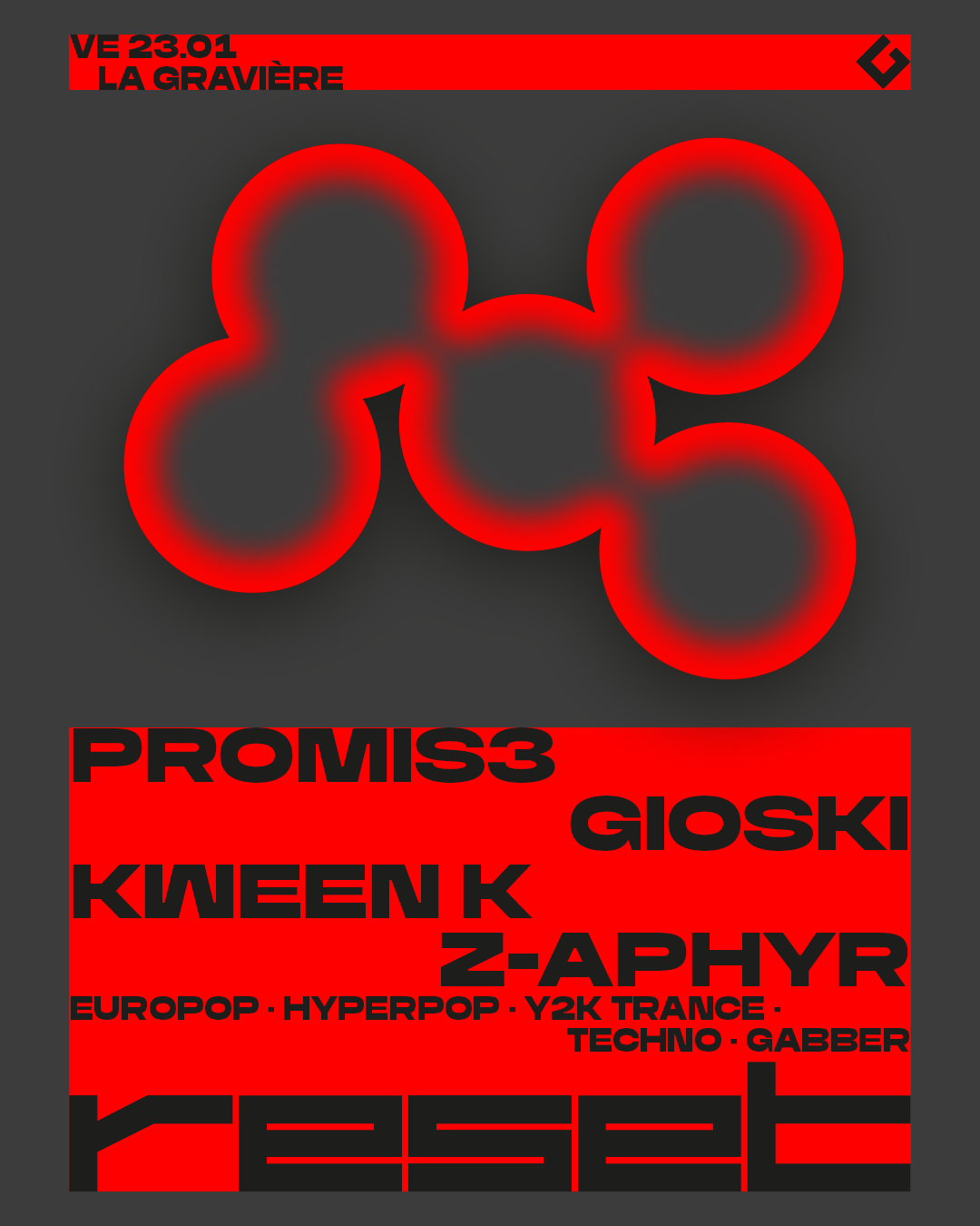 Se taillant une place sur la scène nu-rave, le duo belge 𝐏𝐫𝐨𝐦𝐢𝐬𝟑 rend hommage à la culture club et queer européenne à travers ses prods captivantes, ses visuels envoûtants et son esthétique saisissante. Le duo repousse sans cesse les limites de son identité reconnaissable, mais provocante. Influencé par l’europop, l’hyperpop, la trance Y2K, la rave et bien d’autres genres, le son de Promis3 transcende clairement les frontières musicales. Préparez-vous à découvrir le son du futur avec une touche nostalgique du passé. Avec elleux au line-up ce vendredi 23 janvier, les légendes locales 𝐆𝐢𝐨𝐬𝐤𝐢, 𝐊𝐰𝐞𝐞𝐧 𝐊 & 𝐙-𝐚𝐩𝐡𝐲𝐫.